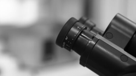Laboratory equipment optical microscope, closeup of scientific microscope with metal lens, data analysis in the laboratory
