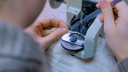 Professional male skinner, furrier using special sewing machine for stitching fur skin at atelier, workshop. Fashion and leatherwork concept