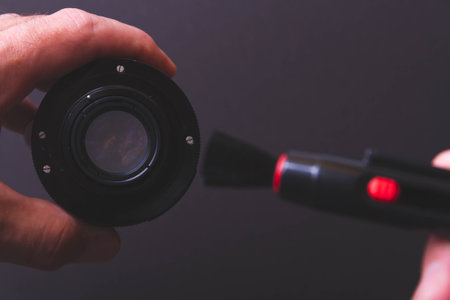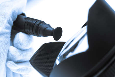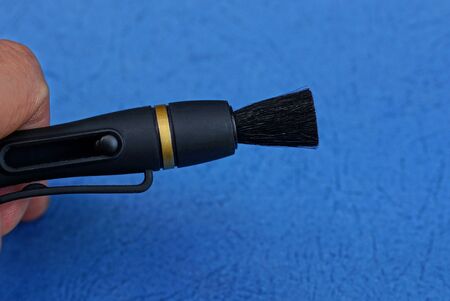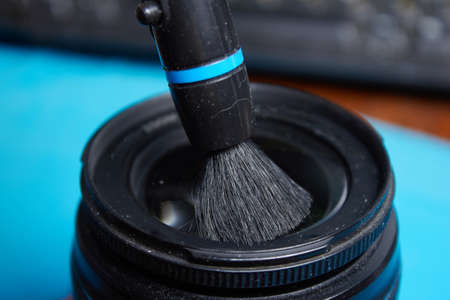 Close-up photo of the process of cleaning the camera lens with a professional brush. Macro photography of objects.