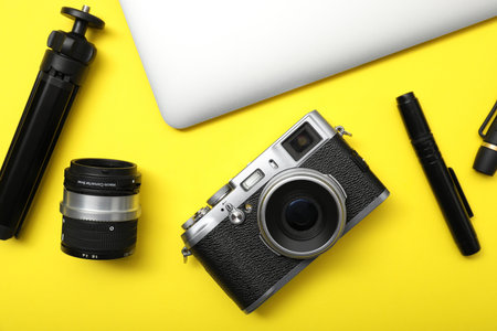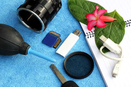 Camera and lens care. Camera cleaning kits and camera gears on colored background