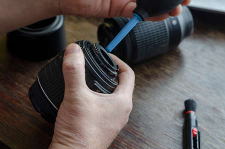 Cleaning the lens from dust. A man's hands use a special rubber blower to blow dust from the inner lens. Care of Photo Equipment.