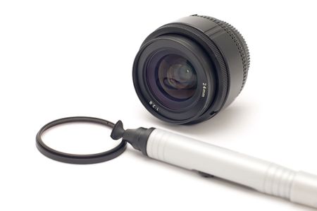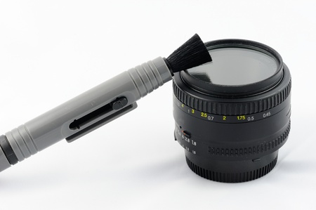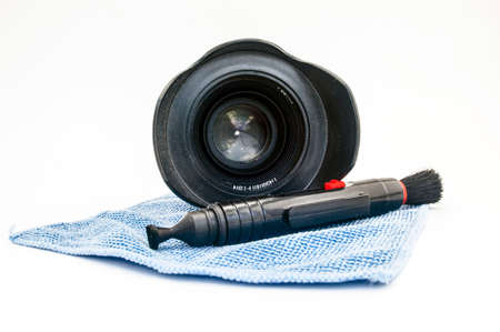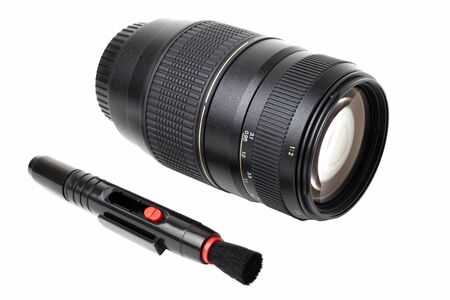 Photo lens and cleaning brush for optics isolated on white background. Lens pen with brush and travel zoom optics.