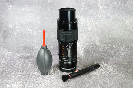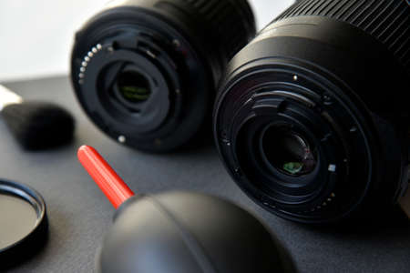 Cleaning dust from photographic lenses concept. Lenses and special cleaning kit on a wooden table. Two lenses, hood, brush, rubber pear.