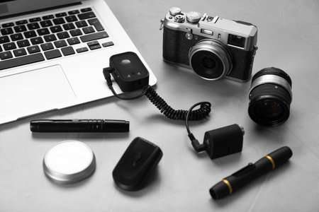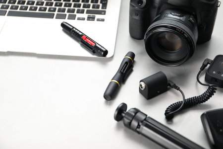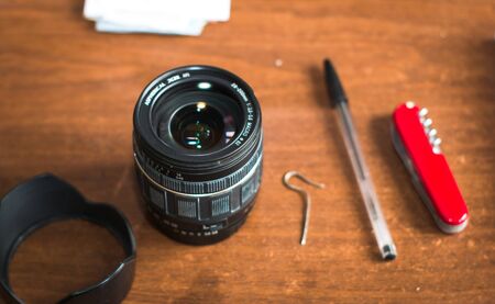 Tech maintenance and support. Top view of photo camera optical dslr lens and repair tool set.