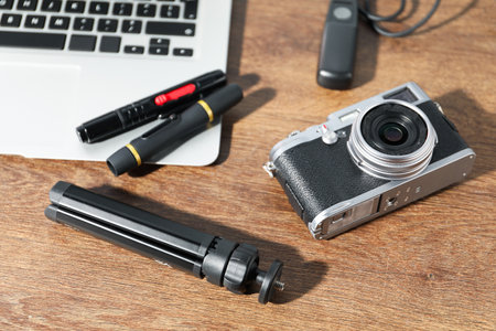 Camera zoom lens on a wooden table. Authentic snapshot of a photography workspace.
