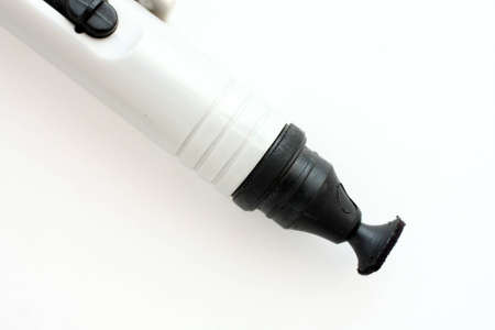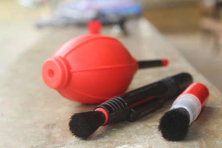 Tools for cleaning photo optics. Pneumatic pear brush on a white background. Camera cleaning kit.