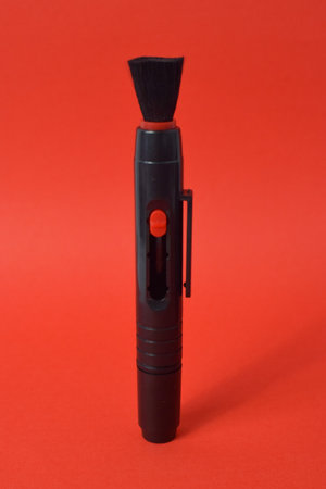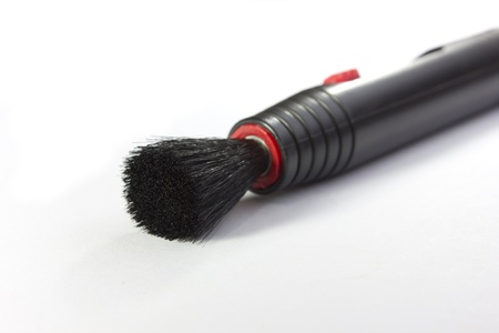 The lens cleaning brush cleans the lens. Brush for cleaning the lens on a white background. Close up.