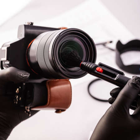 A girl photographer in gloves cleans the lens with special tools for cleaning professional optics. Care for photo equipment.
