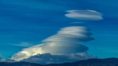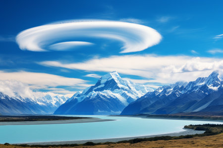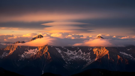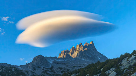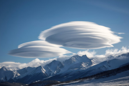 lenticular clouds hovering above mountain peaks, created with generative ai