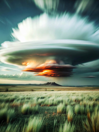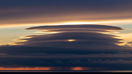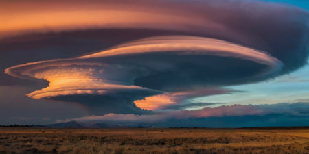 A colossal supercell thunderstorm dominates the horizon, its layered structure resembling a celestial mothership descending upon the vast, empty plains. The setting sun casts a warm, ominous glow on its underbelly, highlighting the immense power and surreal beauty of this rare meteorological event. Its a moment of pure awe, capturing the raw and untamed force of nature in a breathtaking display.