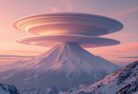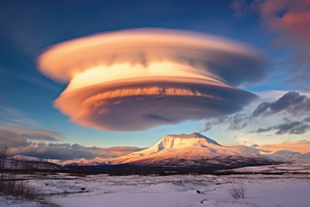 A breathtaking and surreal scene unfolds as a massive lenticular cloud, shaped like a celestial vessel, hovers majestically over a snow-covered mountain peak.