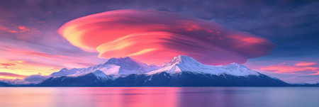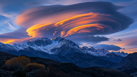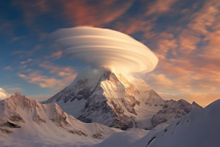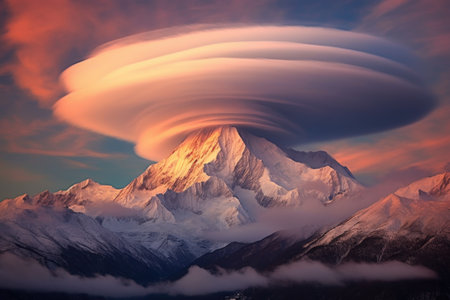 dramatic lenticular clouds hovering above a snow-capped mountain peak, created with generative ai