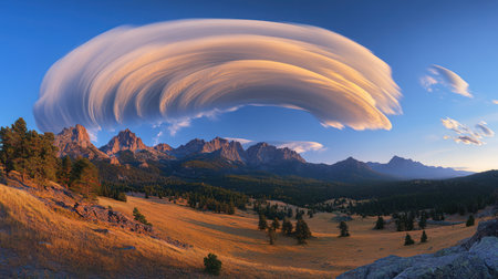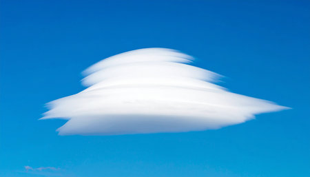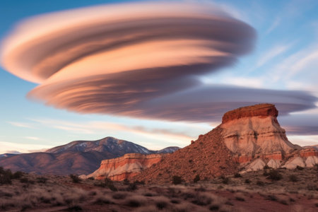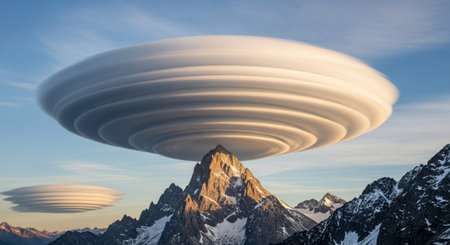 lenticular clouds creating an optical illusion above a mountainous terrain, created with generative ai