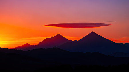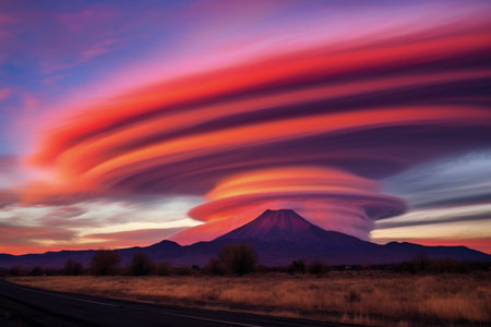 vibrant lenticular clouds contrasting with a dark mountain silhouette, created with generative ai
