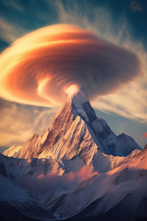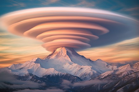 dramatic lenticular clouds hovering over a snow-capped peak, created with generative ai