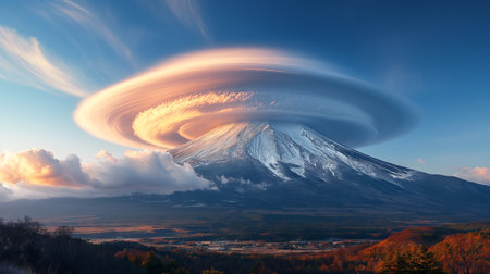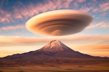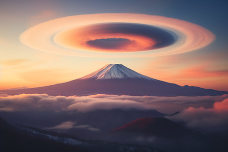 lenticular clouds surrounding a volcanic mountain peak, created with generative ai