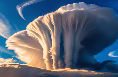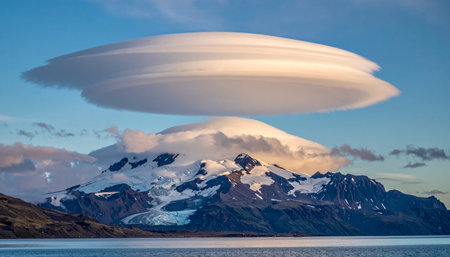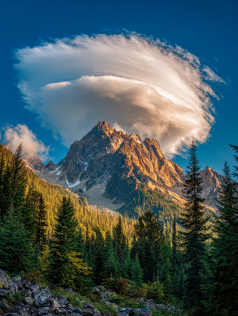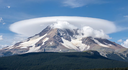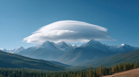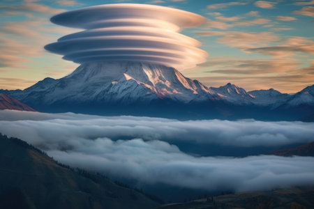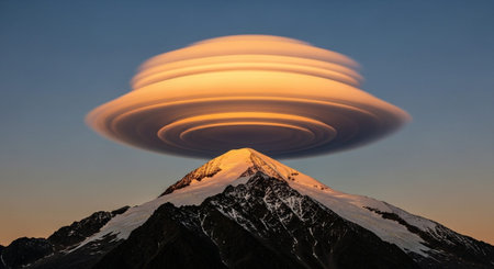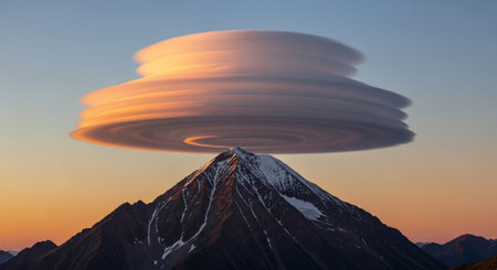 lenticular clouds appearing to cap a mountain peak, created with generative ai