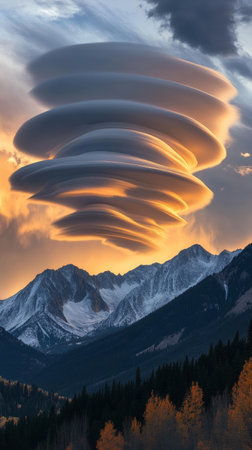 Lenticular clouds over mountain range at sunset with autumn foliage. Atmospheric phenomenon and nature beauty concept