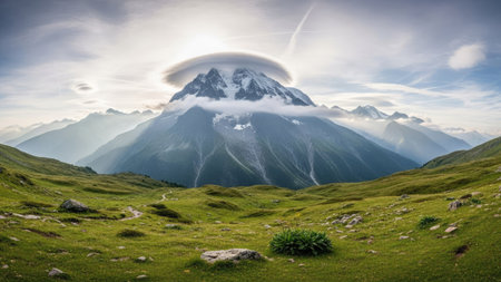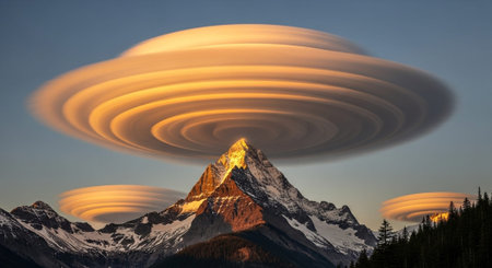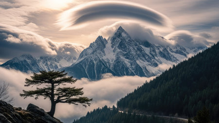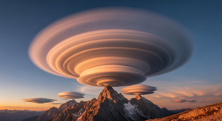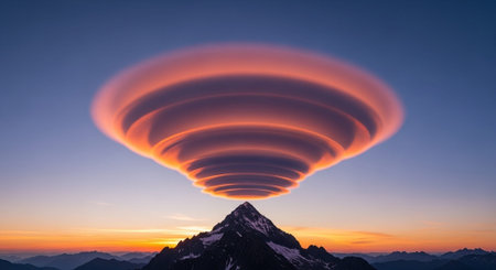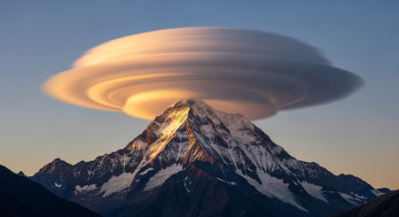 lenticular clouds forming a natural frame around a mountain peak, created with generative ai