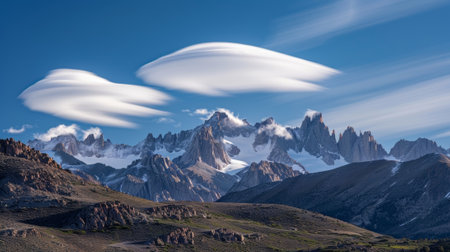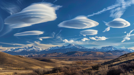 Amazing lenticular clouds resembling flying saucers hovering over a snowy mountain range under a clear blue sky