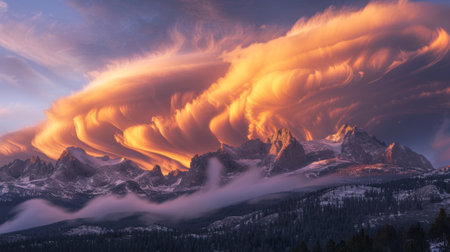A breathtaking view of a snow-capped mountain with mesmerizing cloud formations at sunrise.