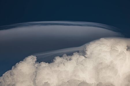 Rare Lenticular cloud Altocumulus lenticularis on top of a cumulus cloud in front of a blue sky