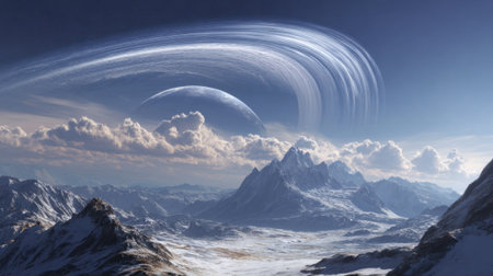 A breathtaking view features towering mountains beneath a swirling cosmic ring and distant planet.