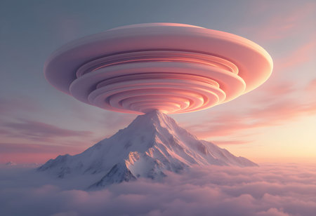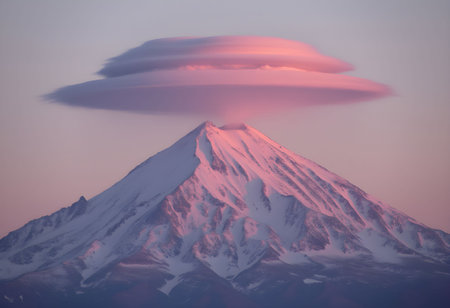 Lenticular clouds hover over a snow-capped mountain, blending pastel pink, purple, and gold hues, creating a surreal, sci-fi-like scene.