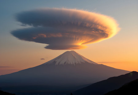 A massive lenticular cloud hovers over Mount Fuji, illuminated by golden sunset hues, creating a surreal and breathtaking natural spectacle.