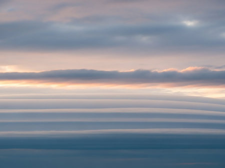Orange showing layered stratocumulus clouds at sunset with soft pink and orange hues interspersed with blue and grey tones creating a visually striking and textured...