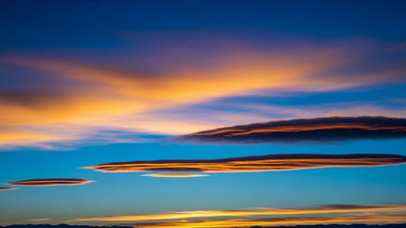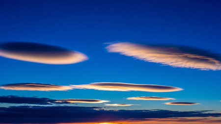 Against showing lenticular clouds illuminated by sunset glow against a vibrant blue sky with orange hues.