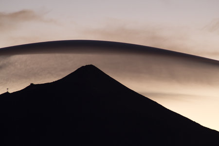 lenticular clouds hovering above a volcanic peak, created with generative ai