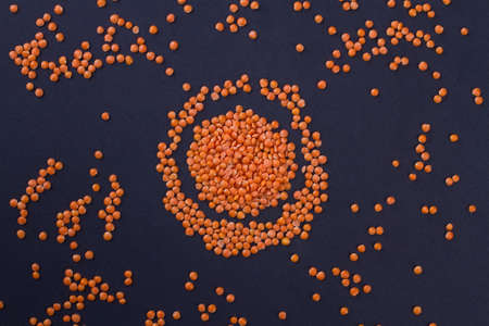 Legumes on a dark background. Bright lentils in the shape of the sun with rays. Healthy food for vegans. Horizontal position. View up. Copy space