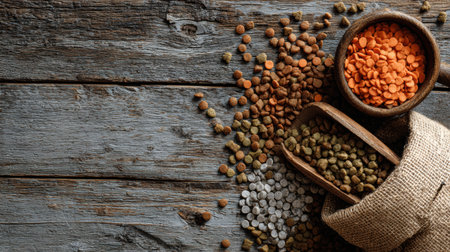 Multi-colored lentils on an emerald green background, scattered yellow and brown, green and orange lentils, healthy legumes banner, top view