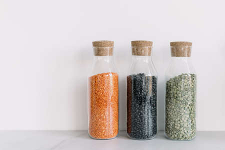 Closeup of transparent bottles with different cereals in modern kitchen with white wall. Home comfort and decor. Kitchen utensils on table. grain assortment