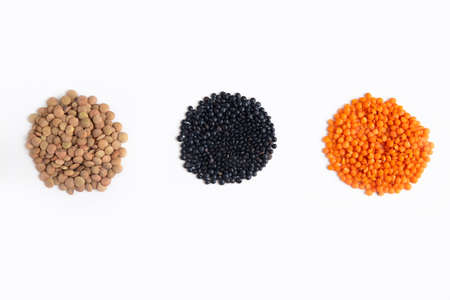 Three varieties of red, black and brown lentils are in the shape of a circle on a white background