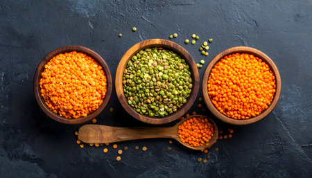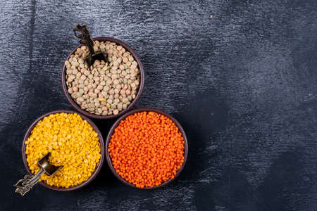 Red, yellow and green lentils in a brown bowls on a black stone background. top view. copy space for text