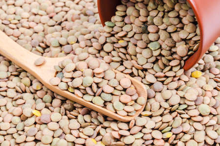 a large amount of raw lentil grain, not cooked but ready to cook for a delicious and high-calorie lentil porridge, close-up of lentil porridge and a wooden spoon
