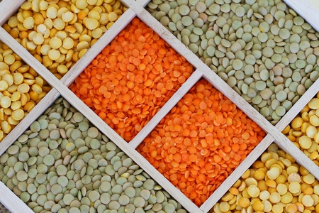 Red yellow green lentils high angle view
