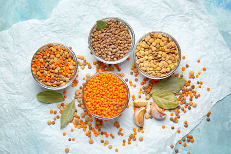 Red and yellow lentils in a bowls flat lay on a light blue background copy space for text