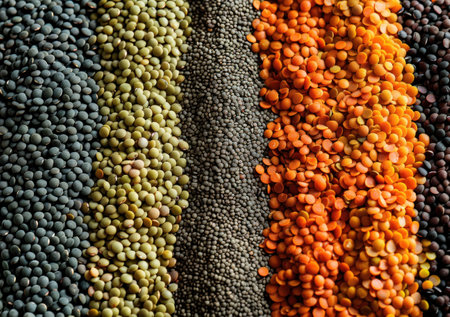 Colorful arrangement of various legumes and lentils on display, showcasing vibrant orange, yellow, green, and beige varieties. Healthy eating and nutrition concept.