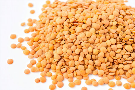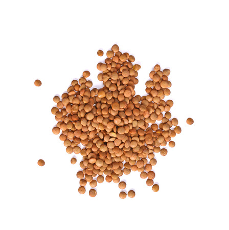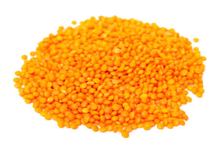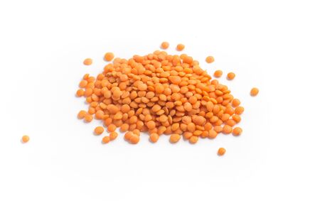 Red lentils isolated on white background. Pile of raw red lentils. close up