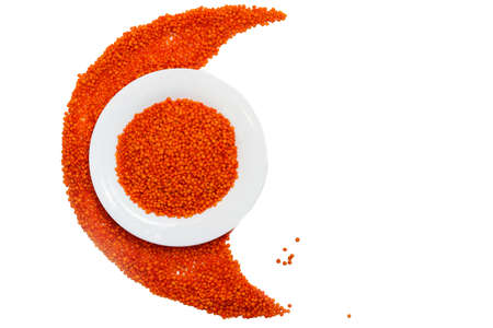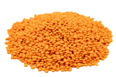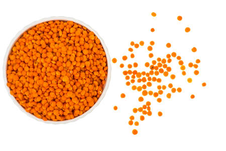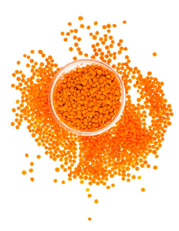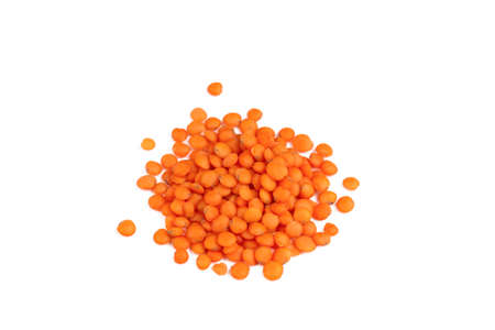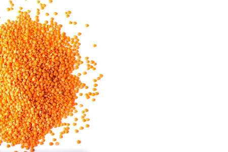 orange lentil beans in a heap on a white background with copy space. Raw super food on a white.