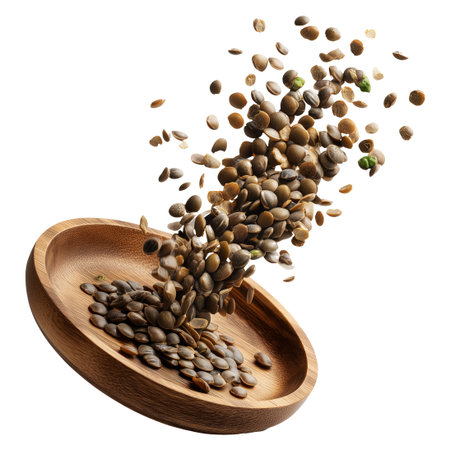 Lot of whole raw green lentil seeds in a wood bowl and around flatlay isolated on white
