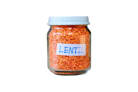 Lentils in a glass jar on a white background, Isolated, Clipping path