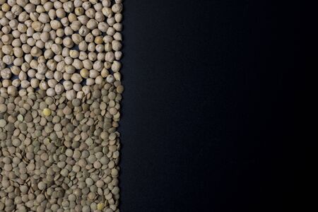 Chickpeas and lentils on a black board, black background., space for text, black background.
