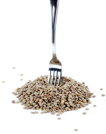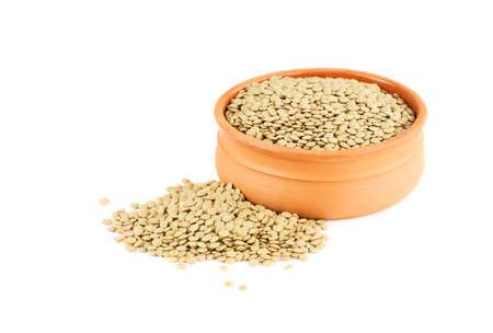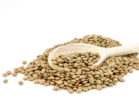 raw french green lentils in wooden spoon isolated on white background. Top view. Flat lay