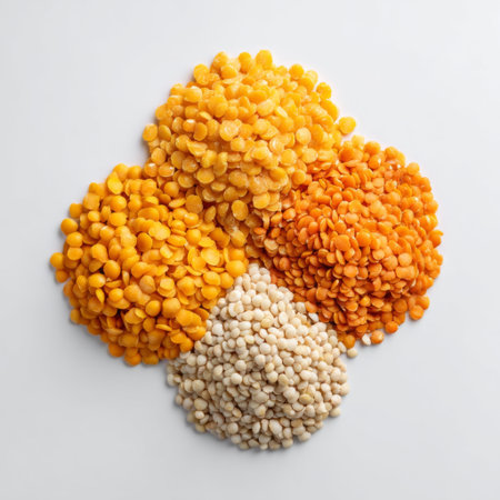 This vibrant composition features an artistic arrangement of split legumes, showcasing shades of yellow and orange, perfect for food photography or culinary inspirations.