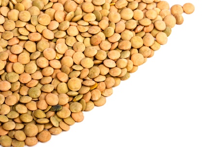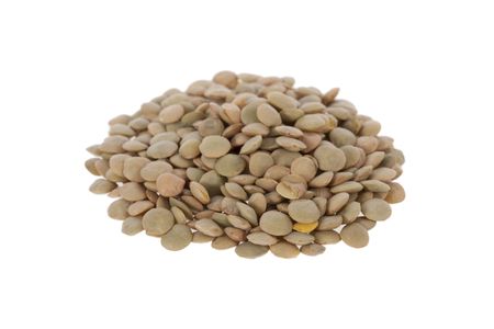 Heap of green lentil isolated on white background with wooden spoon. Shallow DOF.