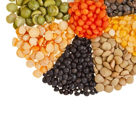 Mixture of dried lentils, peas, soybeans, legumes,beans isolated on white